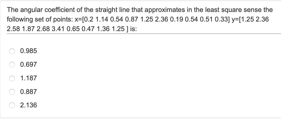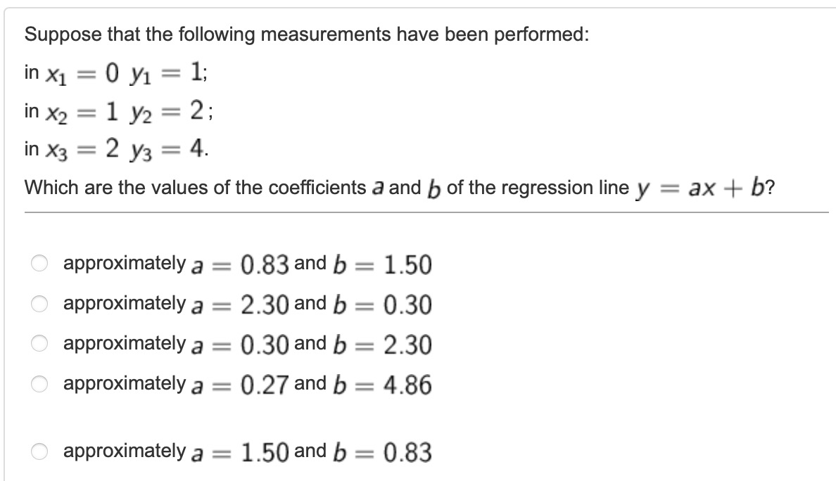 c=polyfit(x,y,1)Correct answer is a = 1.50 and b = 0.83, in this case, E.