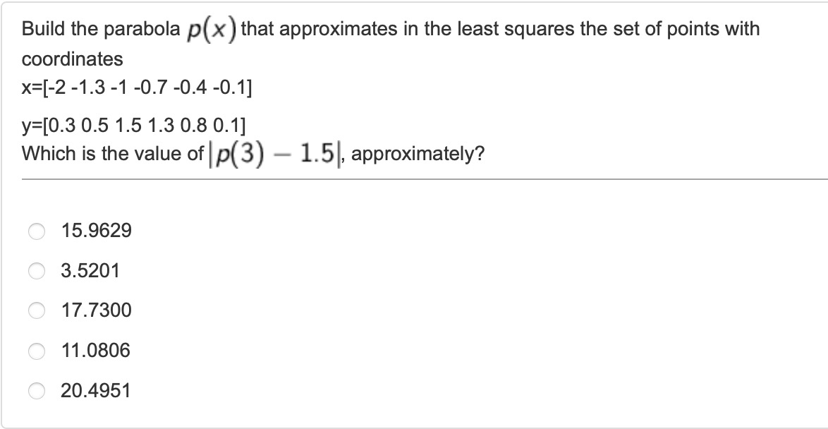 In this question, it is asked to find a specific value after building a parabola. Since it’s a parabola, its degree is 2. First, we’ll define the x and y values, then we will use the polyfit function, then we’ll use the polyval function in order to get the value of 3. Lastly, we’ll use the given formula to find the value.