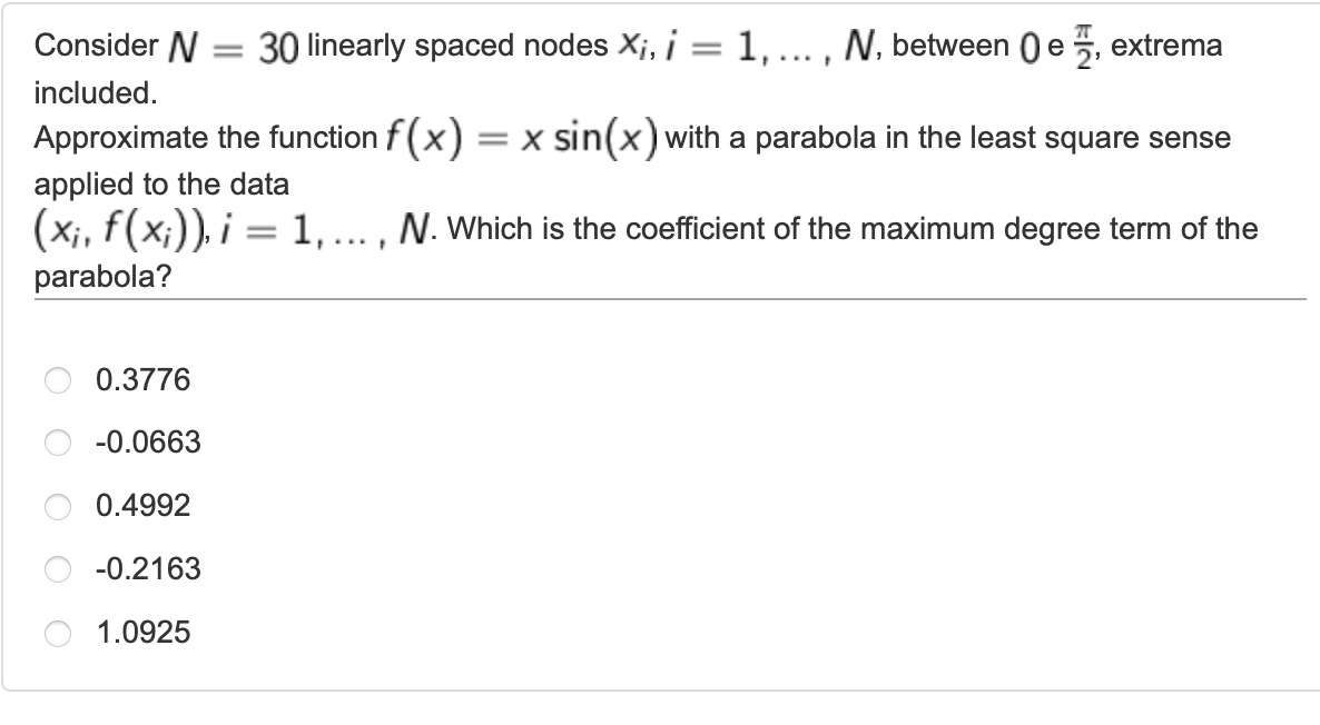 We are asked to approximate the function f(x) = x*sin(x) using a parabola. To do this, we consider N=30 linearly spaced nodes between 0 and π/2. These nodes are used to create data points (x_i, f(x_i)). We need to find the coefficients of the parabola. Specifically, we are asked to determine the coefficient of the maximum degree term in the parabola.