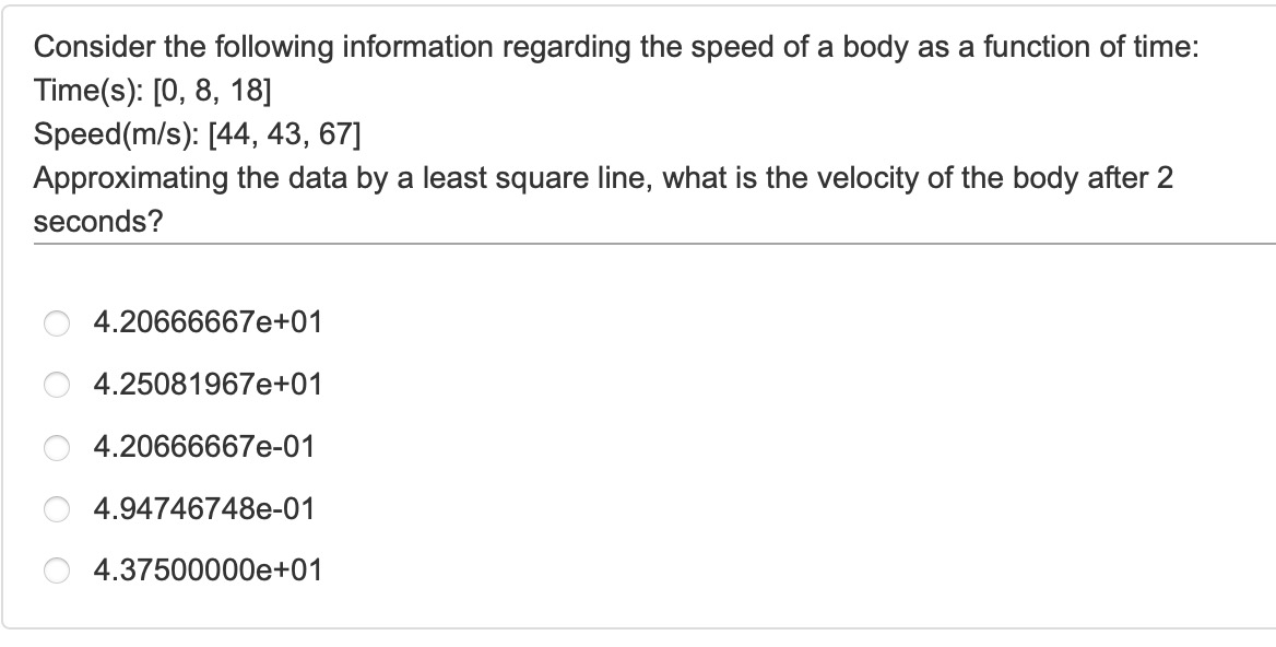 We are given data regarding the speed of a body at different points in time. Our x values are the time values, which are [0, 8, 18] seconds, and the corresponding y values are the speed values, which are [44, 43, 67] meters per second. The question asks us to approximate this data using a least square line, which is its degree 1. We need to determine the velocity of the body after 2 seconds by evaluating the line at that time point.