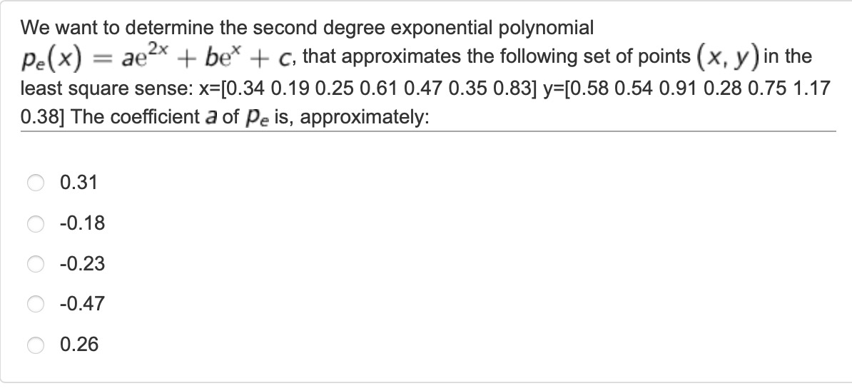 We are given a set of points (x, y) and we want to approximate these points using a second-degree exponential polynomial of the form p_e(x) = a * e^(2x) + b * e^x + c. The polynomial has three coefficients: ‘a’, ‘b’, and ‘c’. We need to determine the approximate value of the coefficient ‘a’ that provides the best least square approximation for the given set of points.