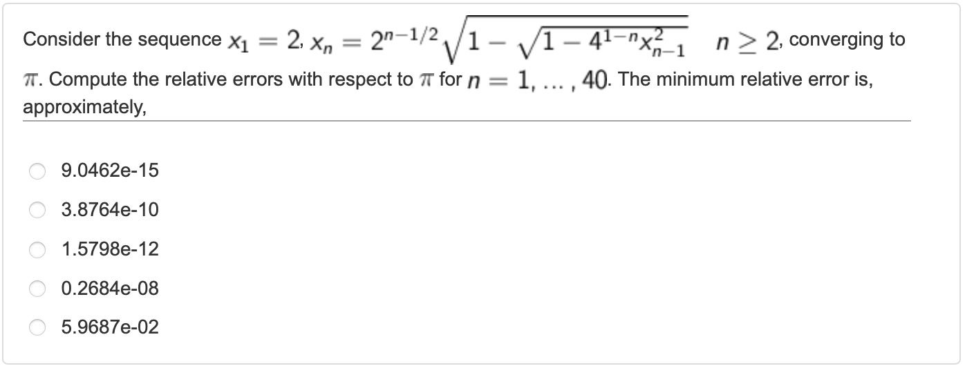 min(abs(x-pi))/piCorrect answer is 3.8764e-10, in this case, B.
